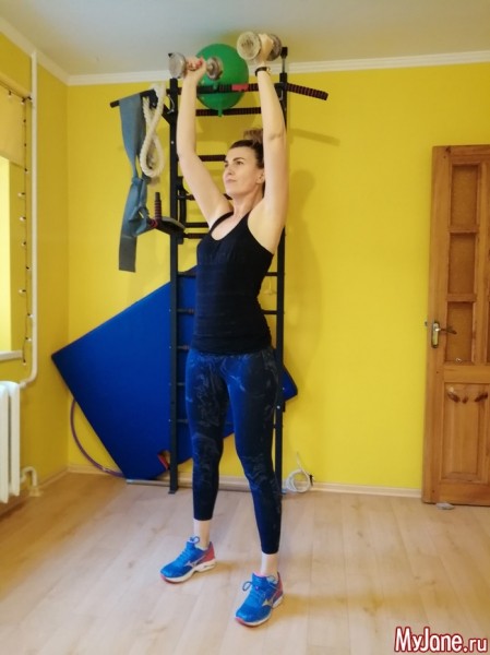 Когда уже не сможете выполнять упражнение «чисто», согните ноги в коленях и присядьте, взяв разгон для следующего толчка гантелей вверх.