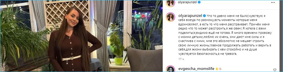 Появившись в социальных сетях с рассказом о поездке с дочками Василисой и Софией, Ольга Рапунцель так и не подтвердила слухи о расставании с её сожителем, которые циркулировали в социальных сетях.
